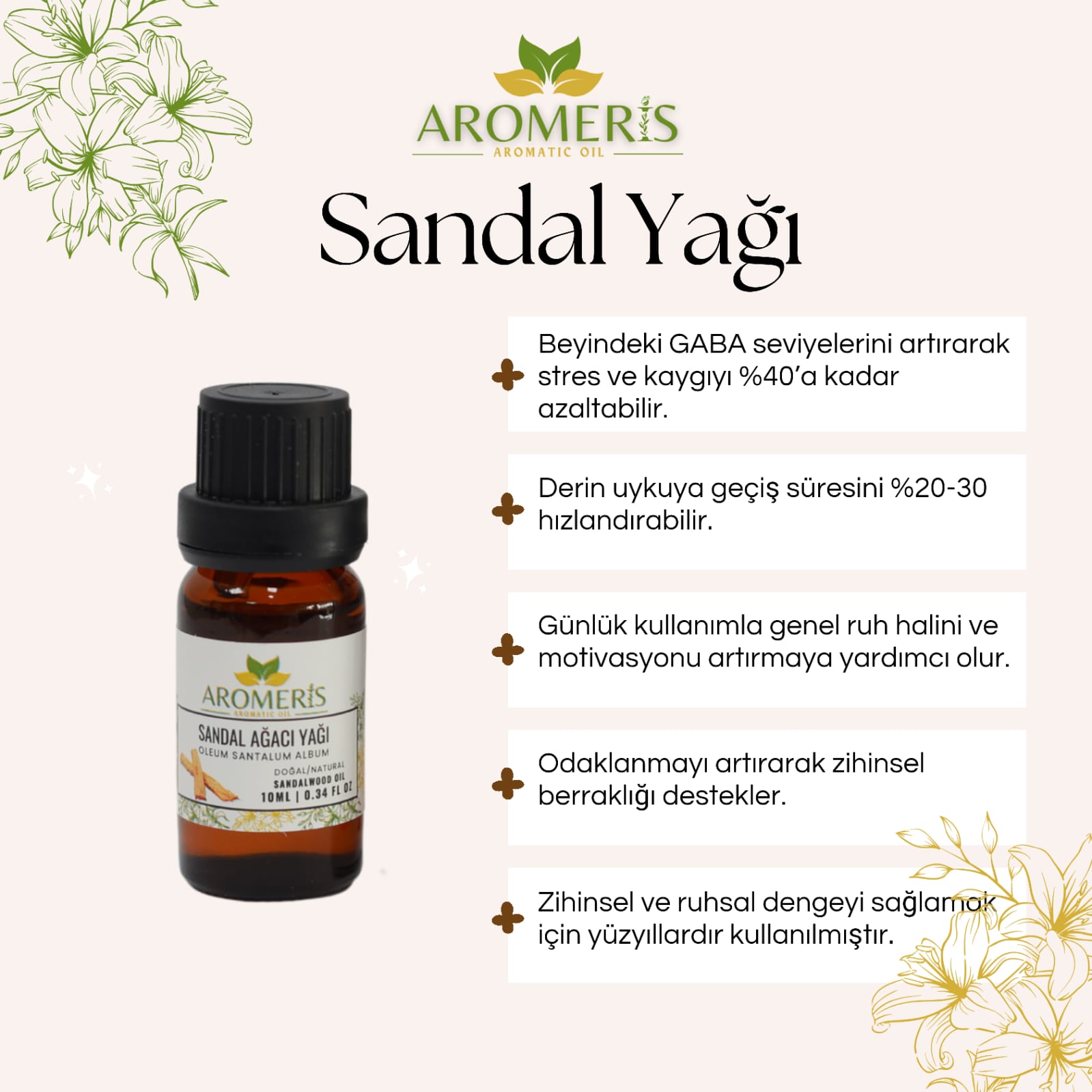 ✅ Meditasyon veya yoga sırasında difüzöre 5 damla ekleyin. Zihinsel açıklık ve odaklanma sağlar.